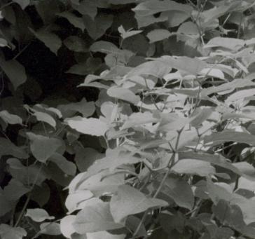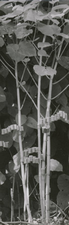 Analoge SW-Fotografie einer Installation mit Japanischem Knöterich in der Natur.