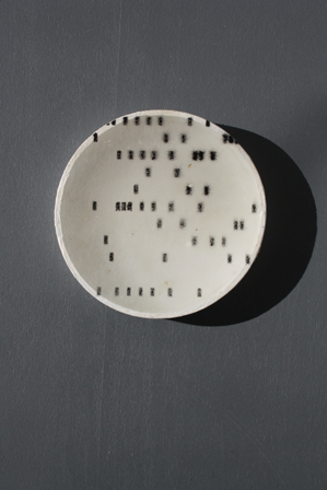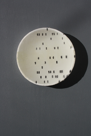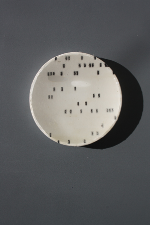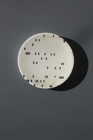 Lochkarten-Bilder: Ab und an kann man bei uns größere seidenähnliche Gespinste der Gespinstmotte Yponomeuta pallida an Bäumen entdecken. Tausende Raupen haben bei ihren Wegen, den Baum auf und ab laufend, ihre Fäden zurückgelassen. Auf dieses dichte Netz habe ich mit Acryllack das Muster von Lochkarten gesprüht. Lochkarten sind ein altes Speichermedium. Diese Arbeiten bilden die ersten Ergebnisse einer Werkgruppe, bei der ich mit den Naturmaterialien Raupen- und Spinnenseide und den künstlichen, analytischen Mustern von Lochkarten experimentiere. Neben den Bildern entstehen, ausgehend von den Lochkarten, ergänzend eine Installation mit Geräuschen.