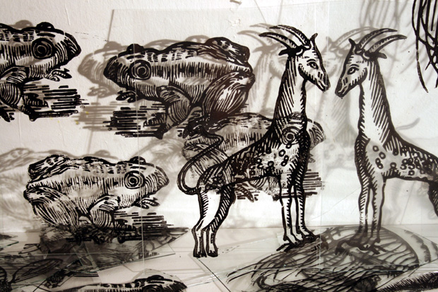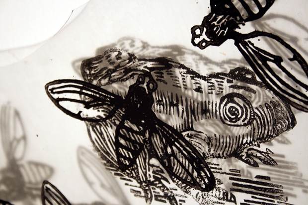 Nach der Natur: 1554 erschien Conrad Gesners reich mit Holzschnitten illustrierte „Buch der vierfüssigen Thiere“. Es entwickelte sich zu einem Standartwerk der Zoologie und so wurde es mehrfach neu aufgelegt, ergänzt und die Bilder neu geschnitten. Auch ich habe einige der historischen Darstellungen erneut in Holz geschnitten um mir die Darstellungsweise anzueignen. Diese nutze ich um Lebewesen ins Bild zu setzten, die heutzutage in das Interesse der Wissenschaft geraten sind. So findet sich z.B. eine transgener nun leuchtender Fisch unter den Motiven. Der Fisch enthält genetisches Material einer Qualle in seinem Erbgut. Bei solch designten Lebewesen wie diesem „Glo Fisch“ erhält die alte Bezeichnung „Nach der Natur“ eine weitere Bedeutung. Hinter jeden der ausgewählten und vervielfachten Lebewesen steht eine Geschichte, die Auskunft gibt über die Beziehungen unserer Kultur zur Natur.