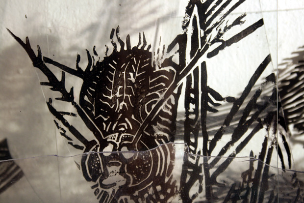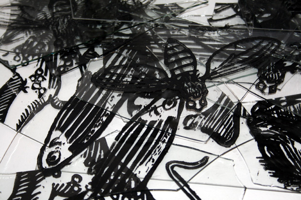 Der Installation liegen derzeit 34 unterschiedliche Holzdruckstöcke zugrunde und ist in Größe und Anordnung variabel. Bei dem Material handelt es sich um schwarze Linoldruckfarbe auf Glas.