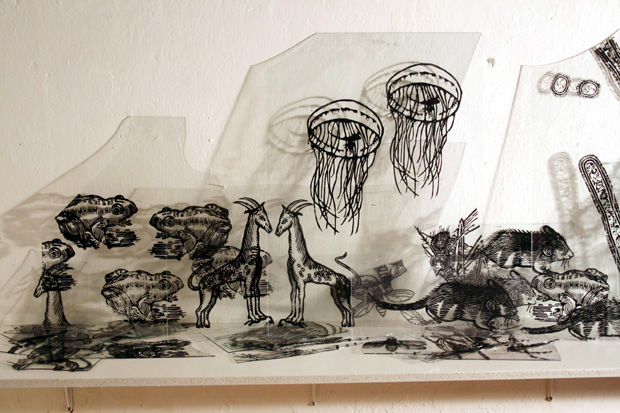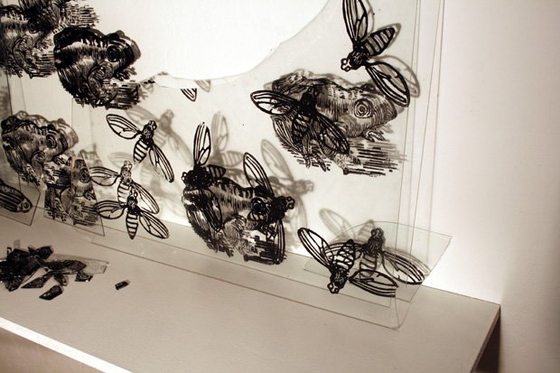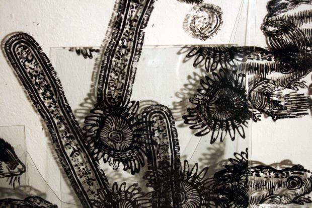 Unter dem Titel "Nach der Natur" zeigt Benjamin Beßlich hier (Galerie Kunstmix, Bremen) eine Zusammenstellung von Holzschnitten, Frottagen, Fotogrammen und Guckkästen. Man entdeckt verschiedene Tierdarstellungen: Katzen, Korallen, Quallen, Mäuse, Frösche, Fruchtfliegen, ein Kamel, Viren........ Die Arbeiten, die den Ausgangspunkt dieser Werkgruppe bildeten, waren die Holzschnitte. Diese Holzschnitte sind nicht, wie gewohnt auf Papier gedruckt, sondern auf Glas. Ebenso wie Papier ist auch das Glas ein Naturmaterial, jedoch erzeugt man mit Glas völlig andere ästhetische Assoziationen: Glas ist transparent. Es wirft Schatten an die Wand. Durch die Ausleuchtung entstehen interessante Überlagerungen und collageartige Verflechtungen des Bildmaterials. Auch der Betrachter selbst wird gespiegelt. Zerbrochenes Glas ist gefährlich. Es schneidet. Man kann sich daran leicht verletzen. Möglichst sollte man es beim Transport mit Handschuhen anfassen, vorsichtig, denn es kann leicht zerbrechen und splittern. Jeder kennt das Gefühl von Glassplittern in den Fingerspitzen und das unangenehme Geräusch, wenn eine Scheibe zu Boden fällt und zerspringt. Dieses Material ist keineswegs zufällig gewählt. Es spiegelt vielmehr die Reflexion des Autors zu dem hier aufgerissenen Themenkreis: Die Manipulation des Natürlichen. Das Material drückt Verletzbarkeit aus.